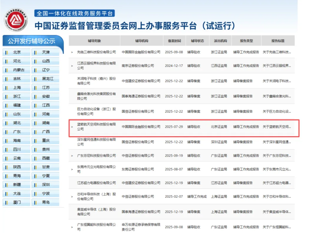 据中国证券监督管理委员会网上办事服务平台披露,近日,蓝箭航天空间科技股份有限公司(下称蓝箭航天)IPO辅导工作正式完成,辅导机构为中国国际金融股份有限公司(下称中金公司)。